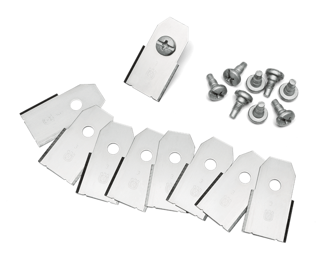 Husqvarnan alkuperäiset hiiliteräksiset turvaterät. Erittäin kestävät terät pysyvät pitkään terävinä. 9 kpl teriä ja kiinnitysruuveja.