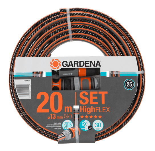 Tässä pakkauksessa on GARDENA Comfort HighFLEX -letku ja GARDENA-järjestelmän osia. Power Grip -profiili takaa täydellisen liitännän letkun ja letkunliittimen välille. Tiiviin, laadukkaan spiraalimaisen verkkokankaan ansiosta, jossa kaksi spiraalia vaikuttaa vastakkaisiin suuntiin, letku kestää painetta ja säilyttää muotonsa, mutta se on silti käytössä joustavampi kuin Comfort FLEX -letku. Tämä johtuu spiraalien suuremmasta tiheydestä, mikä tekee letkusta joustavamman ja helpottaa sen käsittelyä. Se ei mene solmuun eikä kierry, ei sisällä haitallisia pehmentimiä (ftalaatteja) eikä raskasmetalleja ja tietysti kestää myös UV-säteilyä. Pakkaus sisältää seuraavat tuotteet: 1 hanaliittimen, 1 sovittimen, 1 vakioletkunliittimen, 1 sulkuliittimen ja 1 sumutussuuttimen.